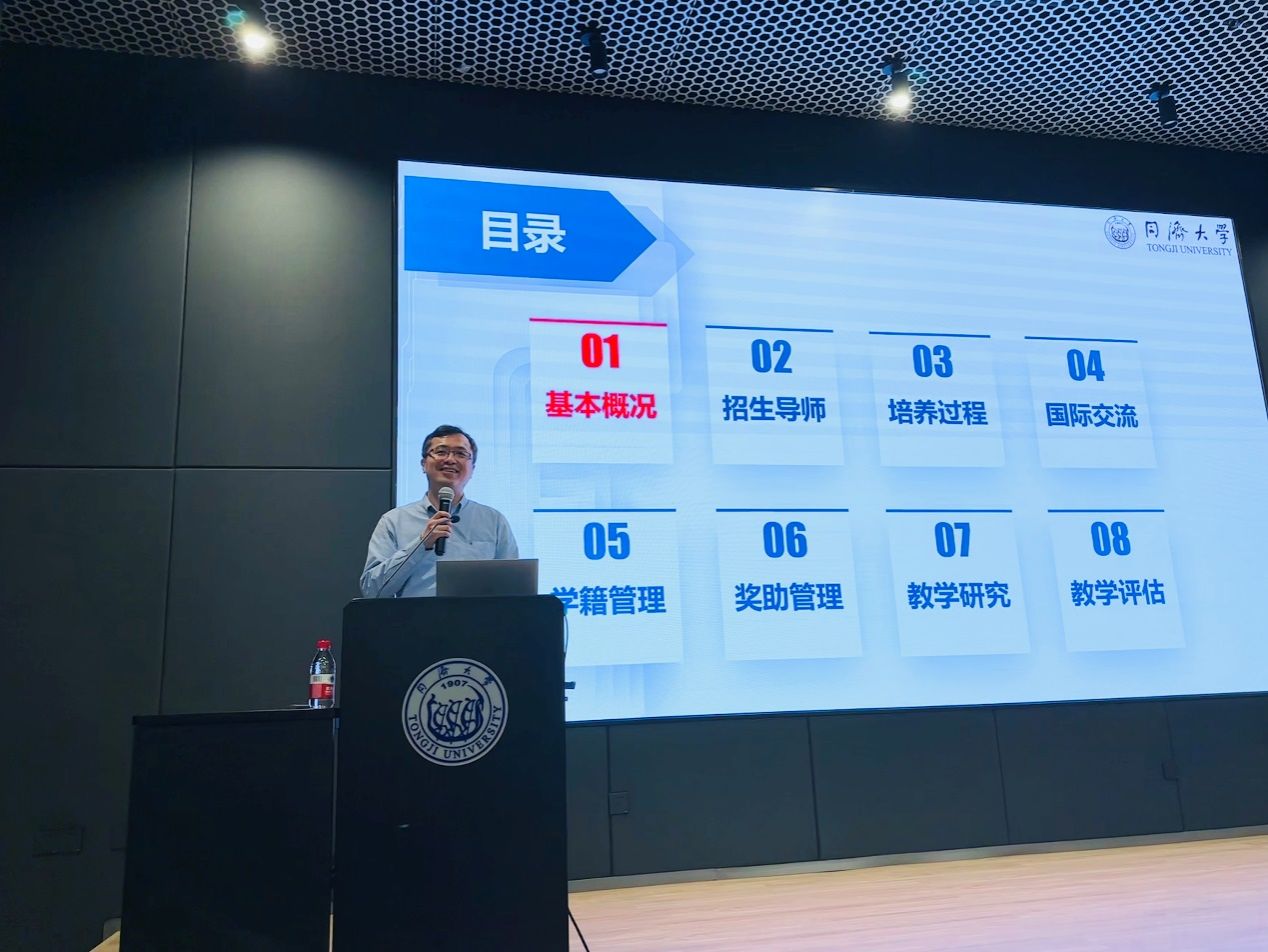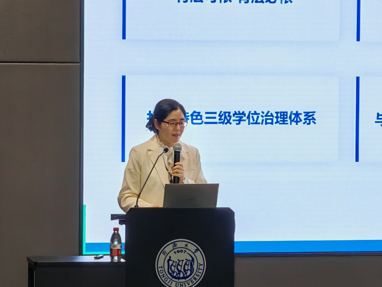 研究生院学位办贾利苹老师系统解读了《同济大学学位授予工作细则》及《同济大学学位授予复核办法(试行)》的修订背景与核心内容。她指出,两项制度的修订以2025年1月起施行的《中华人民共和国学位法》为依据,结合国家关于学术学位与专业学位分类发展的政策导向,进一步完善了校、院、学科三级学位治理体系,推动研究生培养工作的规范化与科学化。报告重点介绍了修订方向:一是强化学位授予流程的统一性与规范性,明确各环节的审议与管理要求;二是优化评审机制,细化学位论文形式与评审标准,增强分类培养的特色;三是建立健全学位授予的复核机制,保障学位申请人的合法权益。