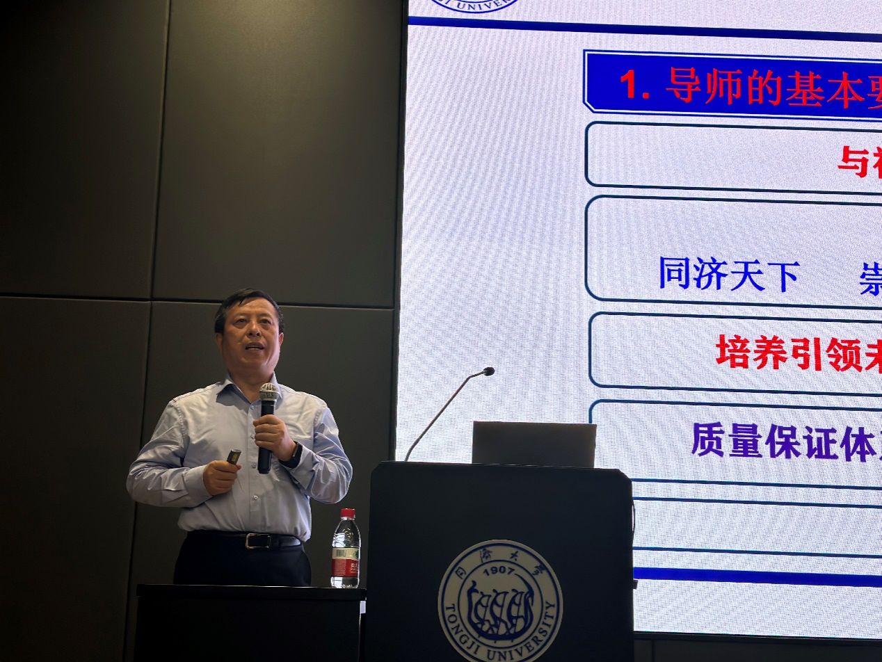 郭爱煌教授围绕“如何做一位好导师——基于督导视角”展开深入分享。他指出,作为高校教师,既要具备扎实的科研能力,也要重视教学实践与育人责任,将教学质量视为人才培养的生命线。郭爱煌强调,导师应从思想认同与行动落实两个层面提升自身素养。思想上要自觉践行同济大学“与祖国同行、以科教济世”的办学理念,主动融入学校质量文化建设;行动上则需深耕学术研究、坚持前沿探索,并通过积极的教学改革与学术交流不断提升育人水平。教师还应积极探索人工智能技术在教学中的融合应用,引导学生运用新技术解决专业问题,提升课堂的时代性与实效性。
