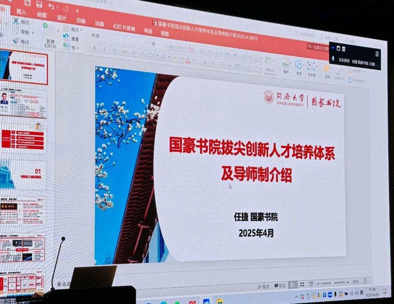 国豪书院副院长任捷教授围绕“国豪书院拔尖创新人才培养体系及导师制介绍”主题作专题报告。他指出,国豪书院作为同济大学人才培养模式改革的试点单位,积极探索以导师制和学分制为核心的拔尖创新人才培养体系。书院依托双院协同机制,与各专业学院共同搭建本研贯通、科教融合的育人平台。通过新生导师、学业导师等多层次导师制度,引导教师从本科低年级开始介入学生培养,实现科研全链条育人。书院还设立个性化课程模块、科研训练项目及创新创业专项,推动学生早进课题、早进实验室、早进团队,着力培育具有国际视野和创新能力的拔尖人才。