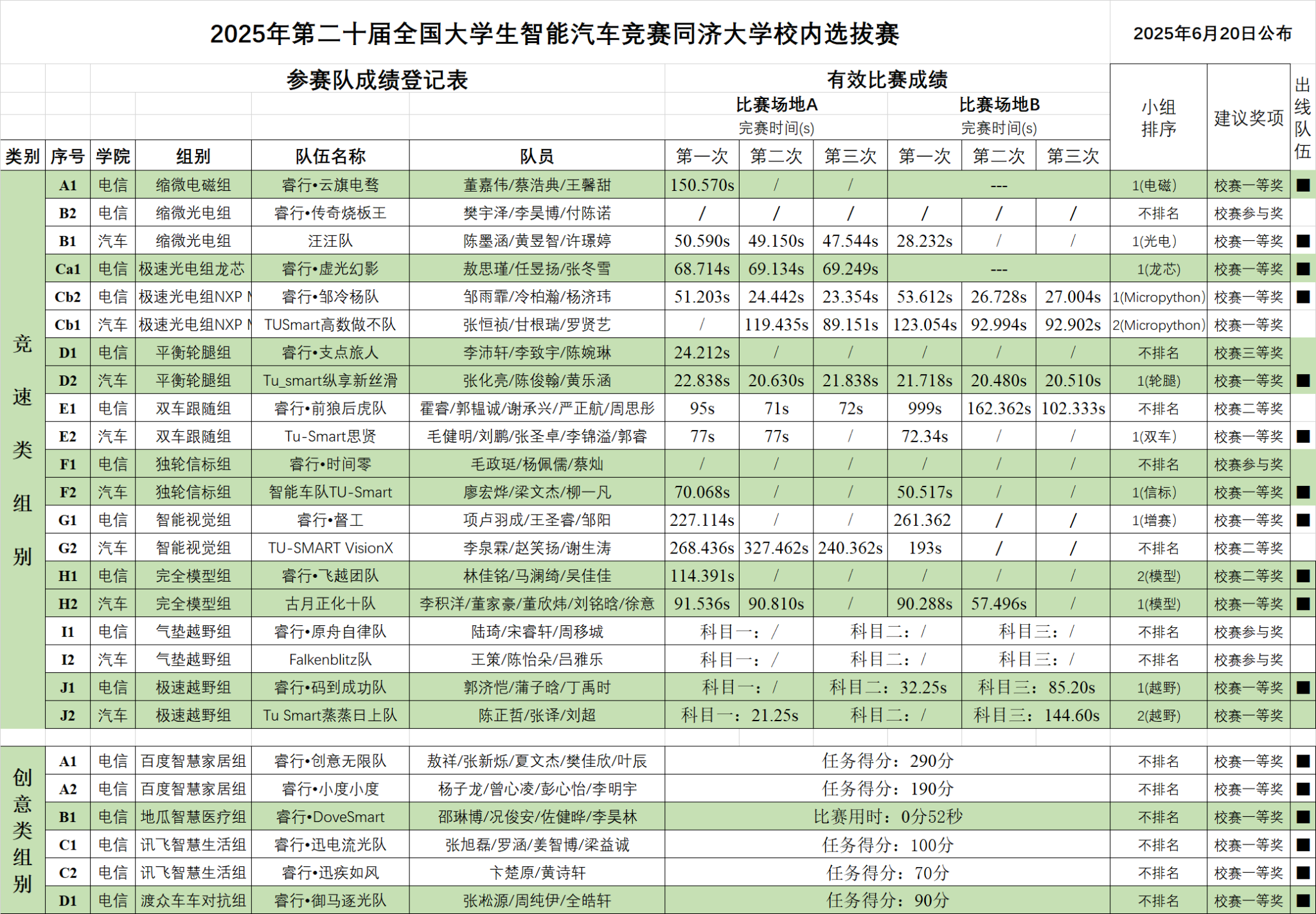 6月7日,同济大学校内赛选拔赛正式拉开帷幕。参赛队伍按组别分别在电子信息与工程学院基地室内赛道和汽车学院基地室内赛道展开激烈角逐。比赛分上午、下午两个时段进行,各参赛队伍充分展现了智能车的技术创新与竞技水平。原定同日举行的室外越野赛道比赛因持续阴雨天气调整至6月17日下午举行,以确保赛事安全和公平。综合类比赛于6月19日在电子信息与工程学院基地赛场举行。