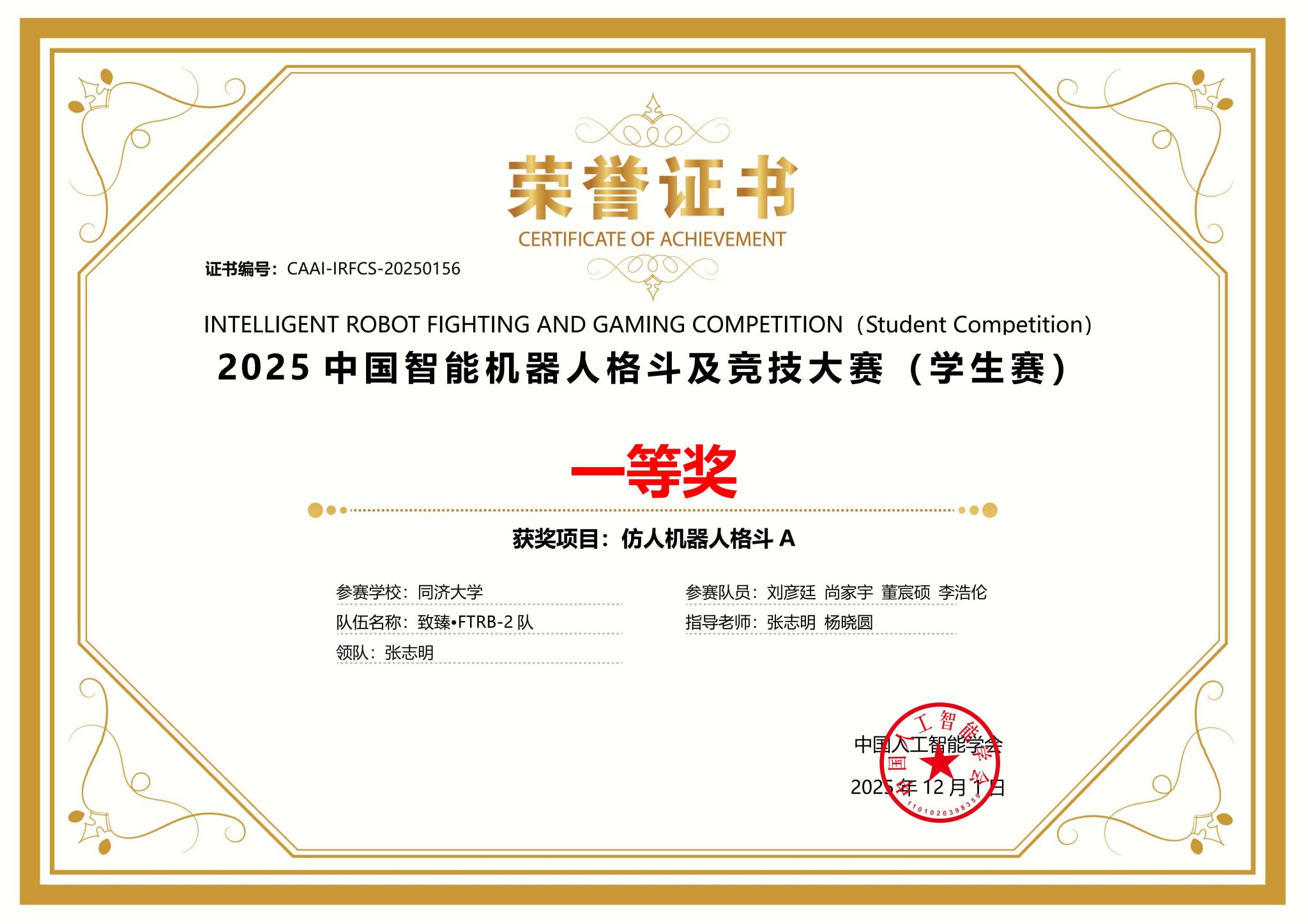 2025中国智能机器人格斗及竞技大赛同济大学获奖证书
