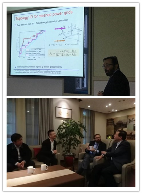 报告中,Giannakis教授首先概述了数据科学和网络科学分析和算法基础中出现的挑战和机遇,随后分别介绍了社交网络中拓扑识别、社区发现、异常标记的方法,基因调控和脑网络中的连接定义、动态变化检测的方法,通信网络中流量控制、路经中继监测的方法,以及电网中的拓扑识别和能量控制等方法。此次报告中,Giannakis教授向在场师生们展现其对数据科学、大数据等领域的认知和见解,以及大数据环境下社交、通信、电力等网络中数据处理和利用的研究现状及发展机遇,为在场师生在相关领域的研究提供了新思考新思路。报告结束后,校领导还与Giannakis教授进行了亲切会谈,并就学术合作等展开交流。